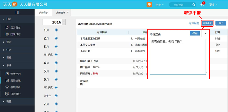 在【我的绩效】界面中【考评详情】区域右上方有个“考评申诉”按钮,点击后即可打开【考评申诉】界面,提交考评申诉。