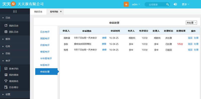 第一种情况,日志、周报都启用了考评时,则按当月日志平均分占25%,周报平均分占25%,月报考评分占50%的比例计算出月报综合分。